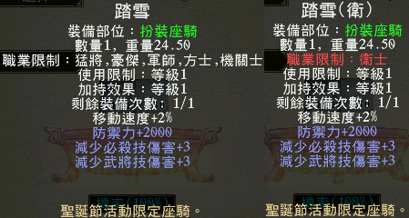 [活動加註]踏雪之念*100+龍神的祝福*50可至煉造房兌換「踏雪」、「踏雪(衛)」。